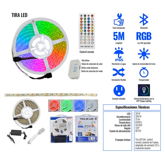 tira led ritmica bluetooth rgb 5 metros 30w5mar